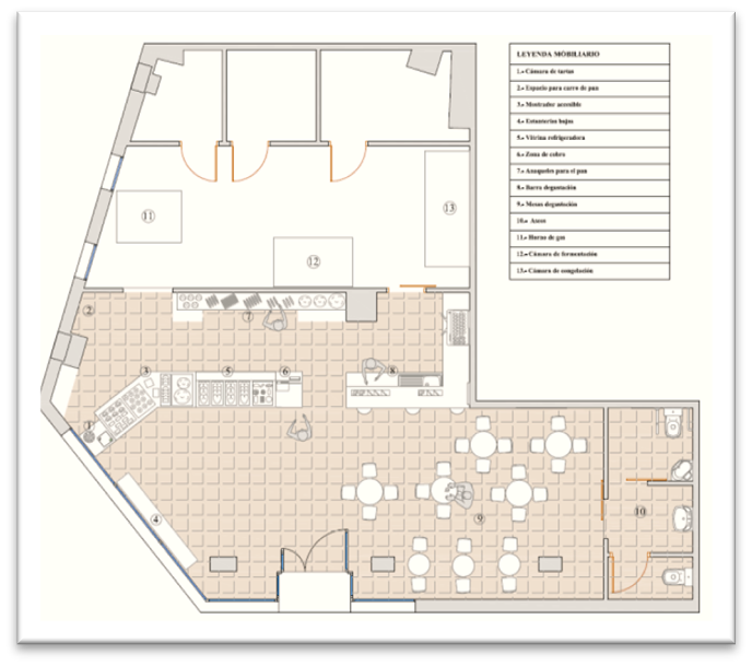 Proyecto y gestión de obras de reforma de local de panadería para añadir zona de degustación, realizando las mínimas actuaciones para su cambio estético completo, manteniendo suelos y techos, y construyendo nuevos aseos adaptados, en un plazo de 1 mes manteniendo la actividad del local durante las obras.